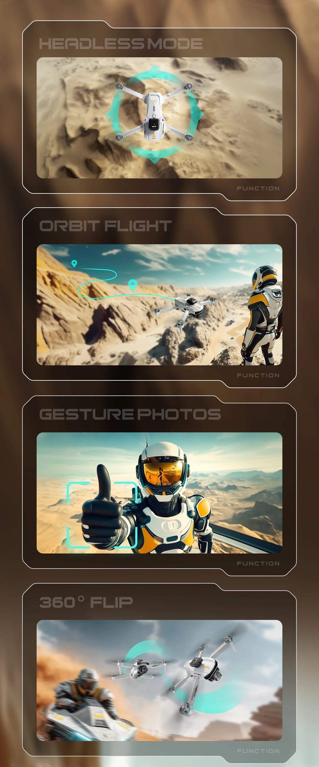 1. The front lens is placed with a wide-angle 4K high-definition WIFI, and the bottom high-definition lens has light flow to switch the shooting angle. The steering gear and gimbal are designed to stabilize the shooting angle. The shooting angle is electrically adjustable to 90°. The wide angle is 120°. EIS electronic anti-shake is added to make the photos clearer.