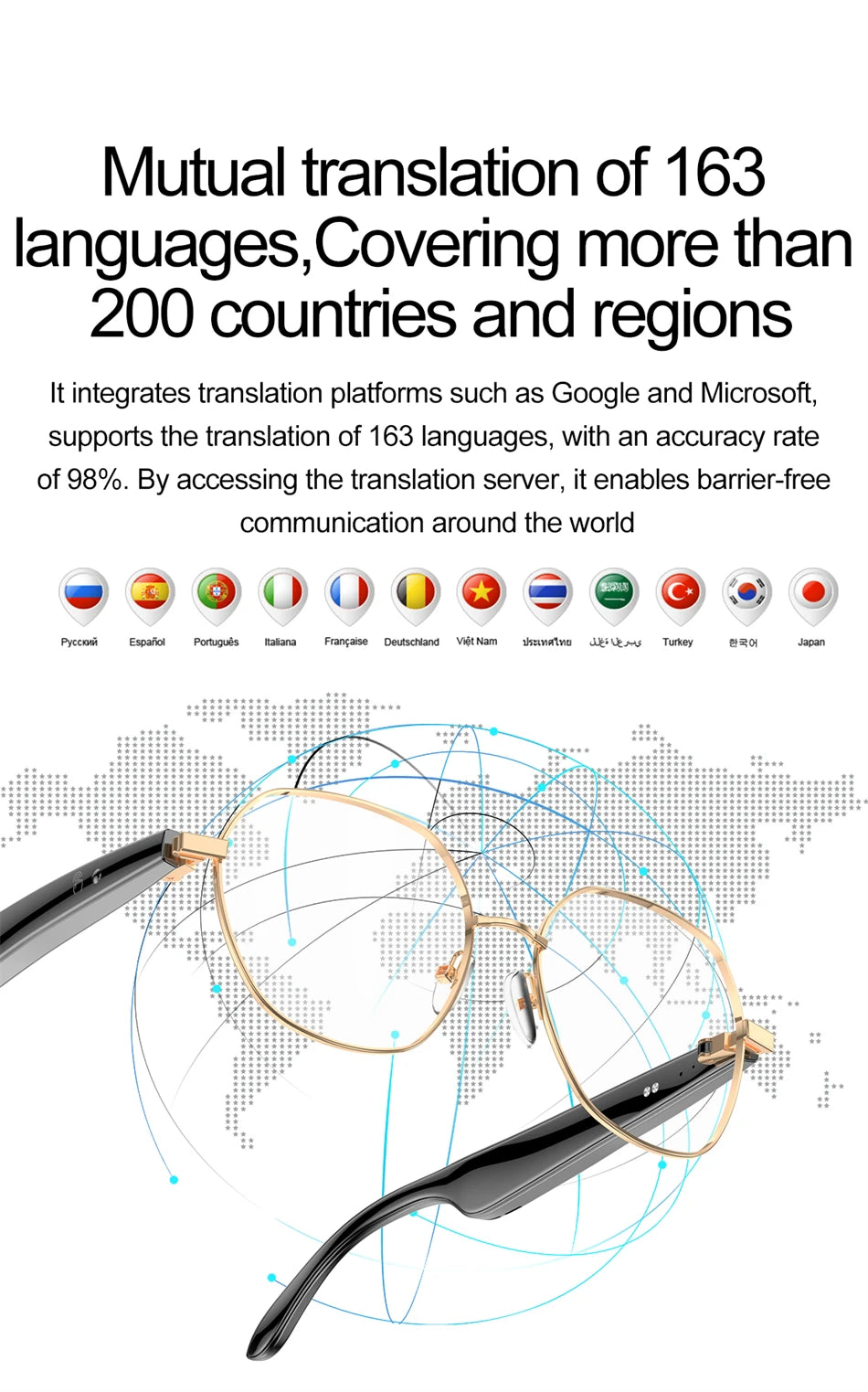 AI Bluetooth Audio Call Fashion Smart Glasses: Equipped with functions such as AI intelligent voice and video real-time translation, AI dialogue and Q&A, AI intelligent translation (including translator mode and the translation mode combining glasses and mobile phone, which can customize the translation of more than 163 languages), voice notes, sleep aid mode, photo translation, remote control photography, Bluetooth calling, automatic power on and off with intelligent Hall effect sensing, intelligent voice assistant, music playback (capable of operations like music switching and pausing for music appreciation), remote control photography, etc. It adopts the low-power AB5712F low-power chip, has the ENC noise reduction function, with ultra-low latency and long battery life. Weighing only 25 grams, it is so light that it gives almost no wearing sensation and is extremely comfortable to wear. It can be equipped with various types of lenses, such as sunglasses lenses, anti-blue light lense