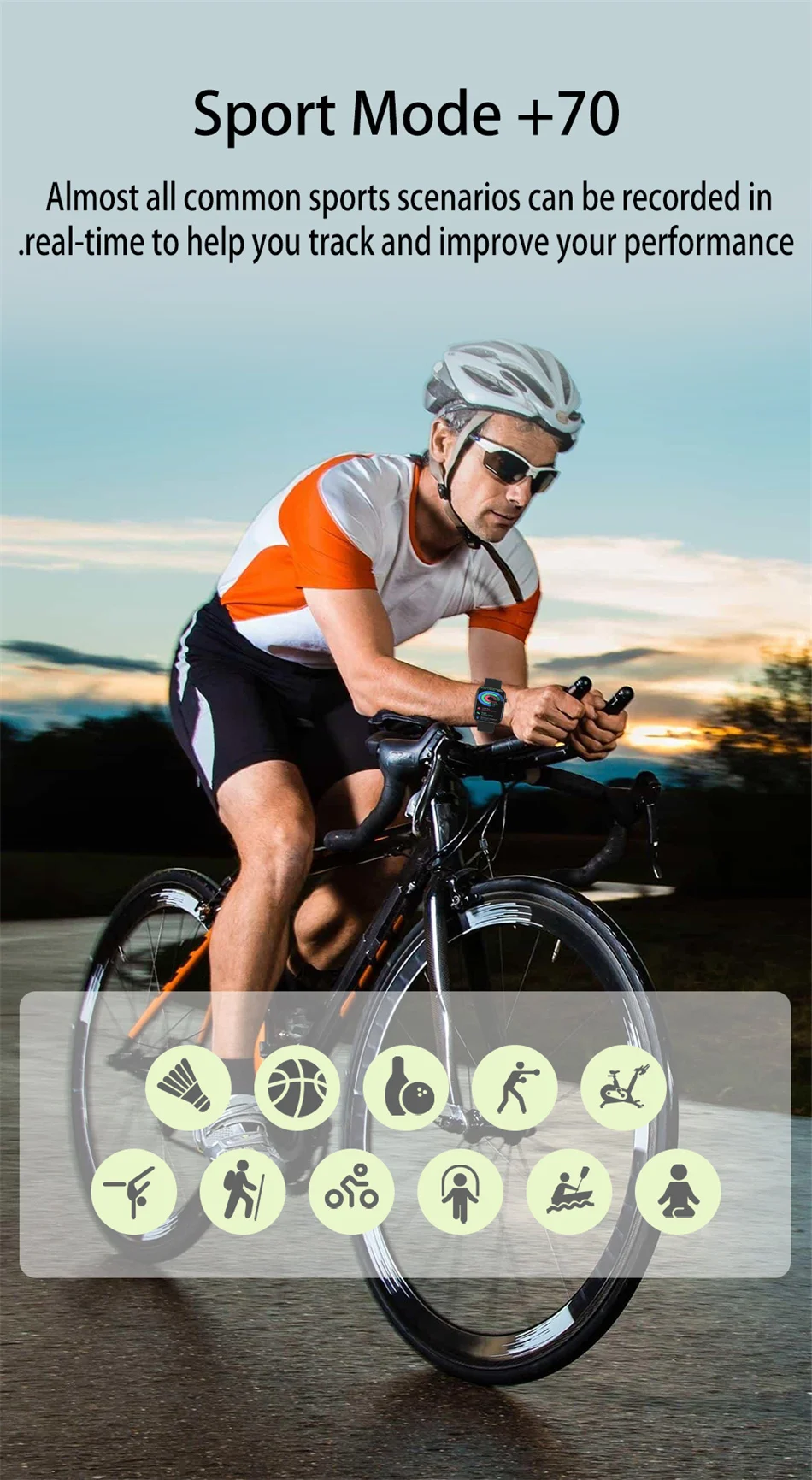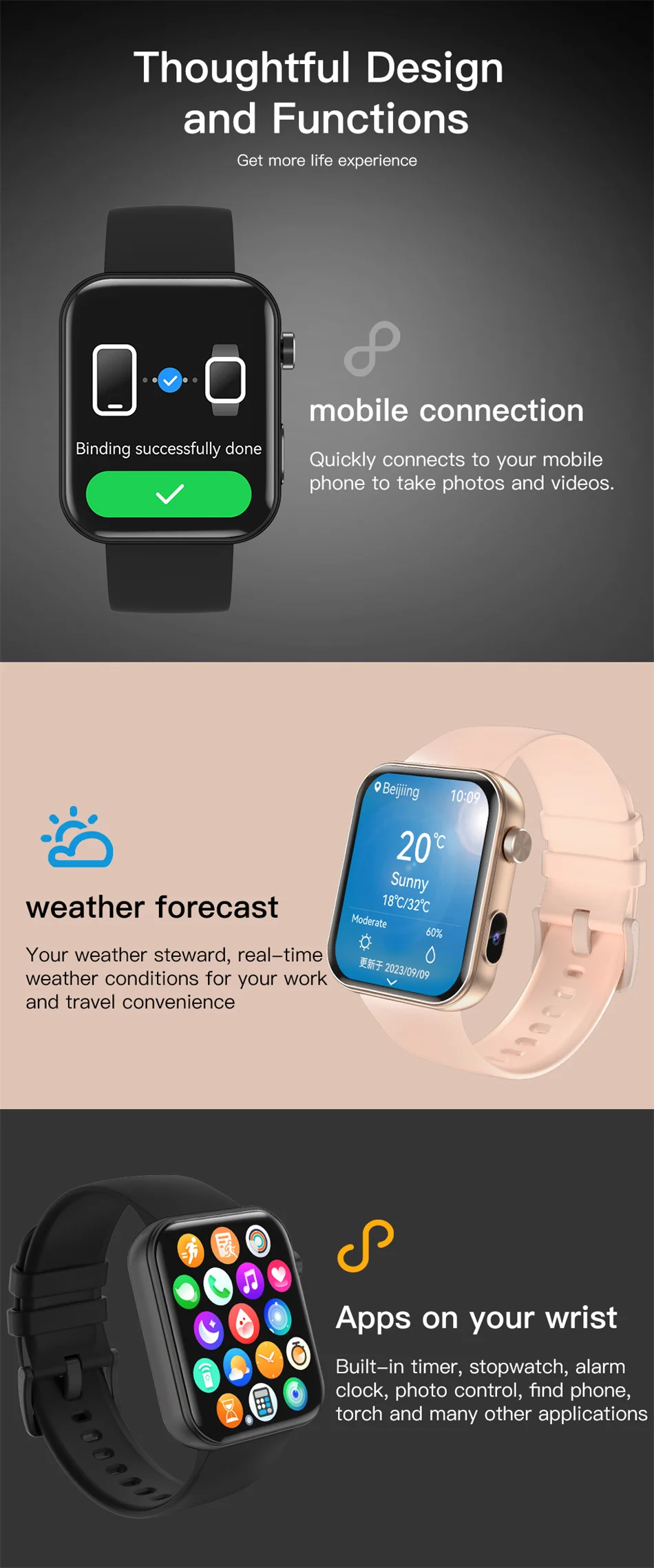 Bluetooth calling,Camera,Album,Sound recording,Blood oxygen,Heart rate,IP67 waterproof,Pedometer / Calories,Sleep monitoring,Alarm clock reminder,Stopwatch,Built in 8+12 types of sports (12 types can be pushed in the background to replace 80 types of sports),Sedentary reminder,Call/SMS push,Message notification,Remote control music,Remote control camera,Dial pad, find phone, find wristband, dial switch, distance, motor, camera