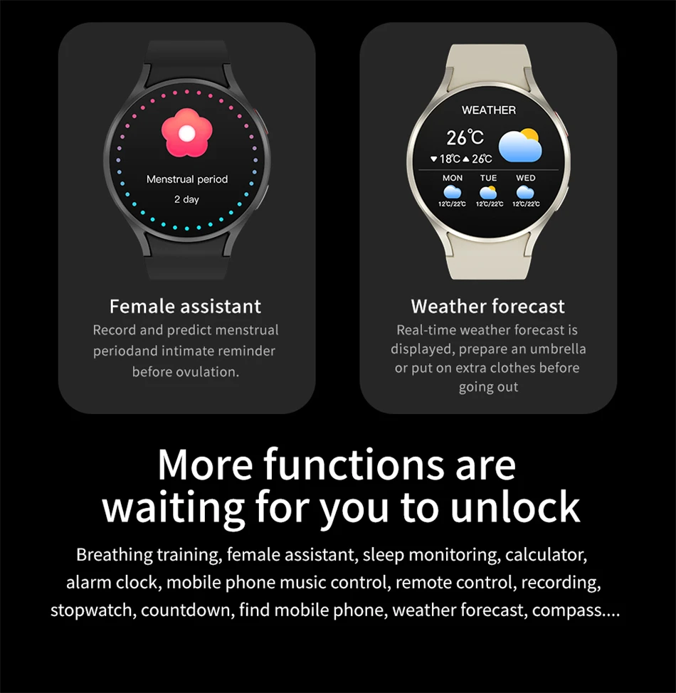 Function: Passometer,fitness tracker,sleep tracker,Mood Tracker,Message Reminder,Call Reminder,Answer Call,Dial Call,REMOTE CONTROL,Push Message,Altitude Meter,tourbillon,Big Three Needles,24 hour instruction,Chronograph,Alarm Clock,Small Second,Heart Rate Tracker,Interactive Music,Noctilucent,Thermometer,Calendar,Compass,Lighting,Countdown,Calculators,Oxymeter