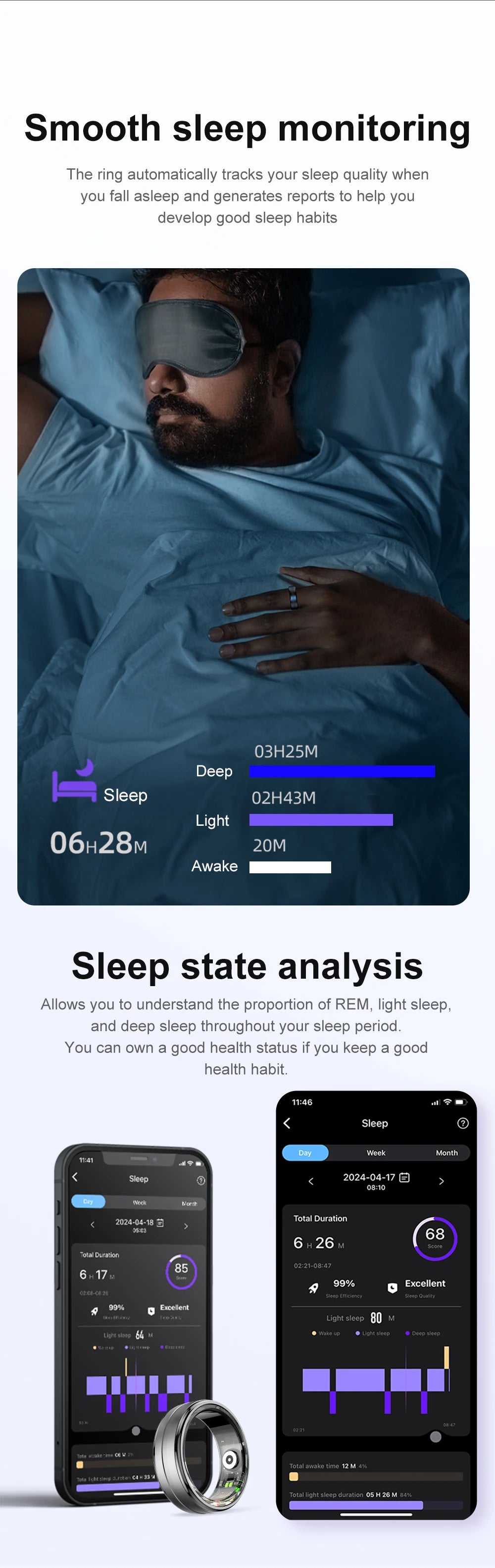 Wear it worry-free every day, the aviation grade aluminum alloy shell, paired with advanced low-temperature potting technology, grants the ring a 5ATM&IP68 water resistance rating. the R06 Smart Ring is not just feather-light but incredibly durable and resistant to wear. Its ruggedness is matched by monitoring accuracy, with 20 different exercise modes that monitor your heart rate data in real time during exercise.
