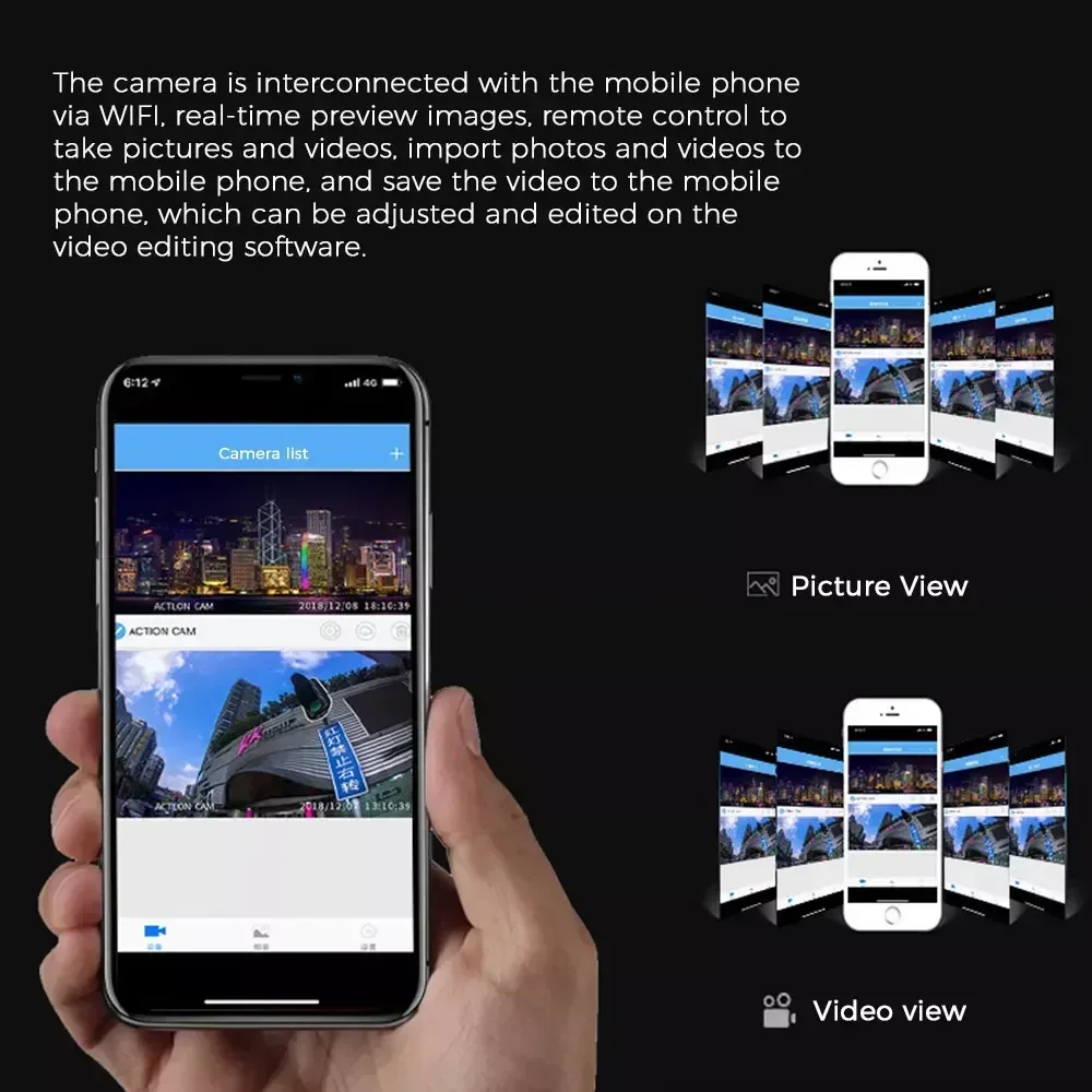The camera is interconnected with the mobile phone via WIFI, real-time preview images, remote control to take pictures and videos, import photos and videos to the mobile phone,