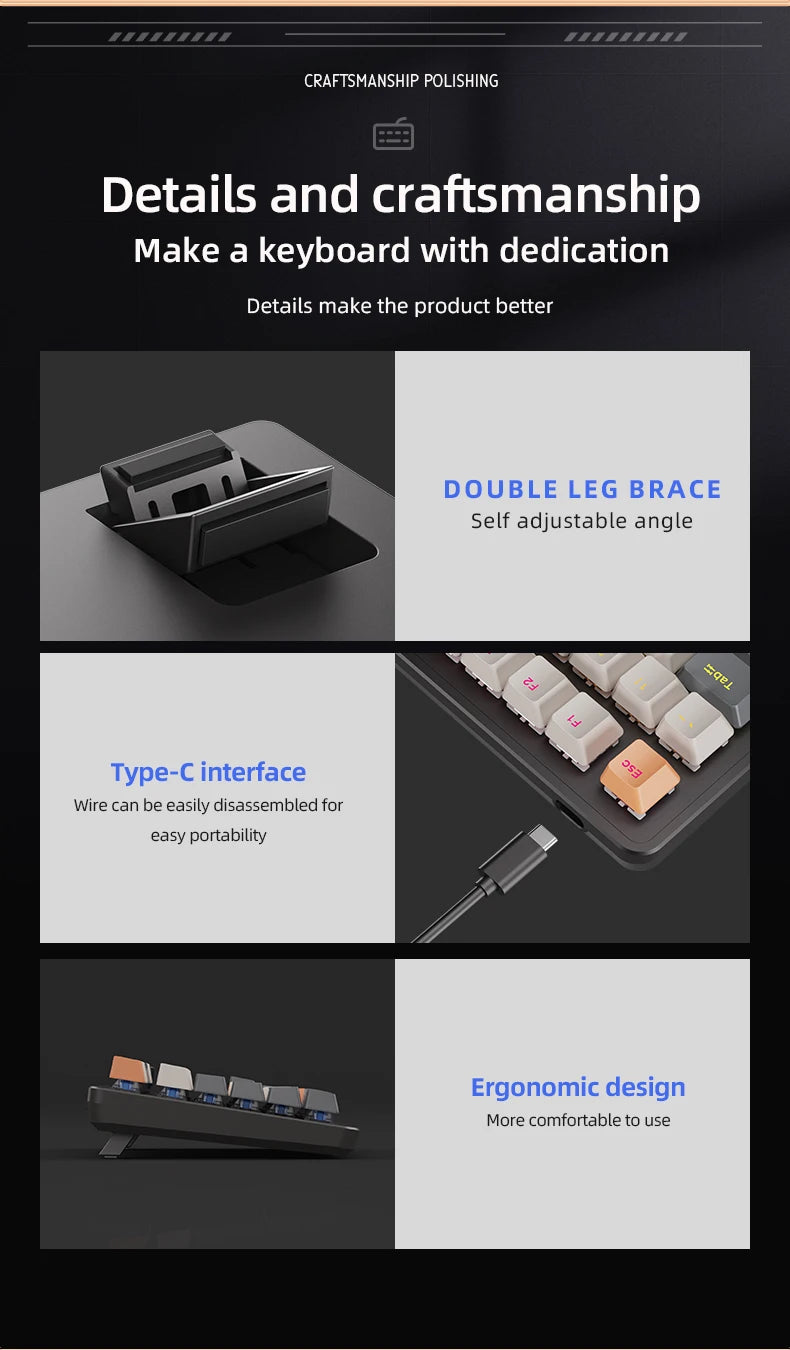 4- Mechanical switch: Blue Switch,Full key less-punch,No fear of aridus combinations of keys.