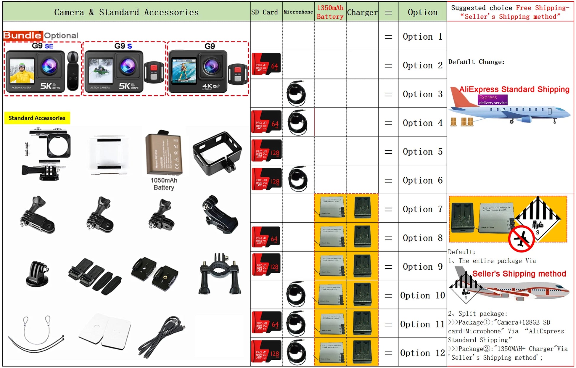 ■Option9=Standard+128TF Card(U3 V30)+Charger + 1350mAh Battery