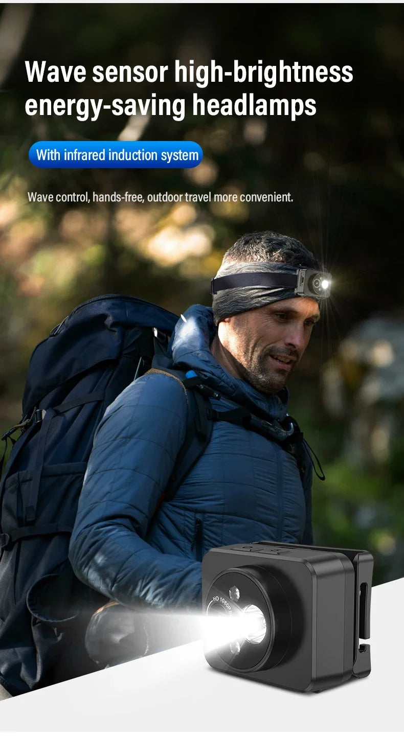 Action Camera Headlight First Perspective 2MP Sports Camera Smart Wave Hand Induction Video Recorder Built-in Battery Action Cam