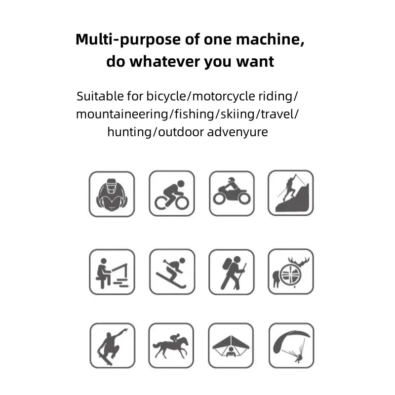 * Wide range of applications, suitable for bicycle/motorcycle riding, mountaineering, fishing, skiing, tourism, hunting, outdoor adventure, etc. Supports installation of multiple models and helmets.