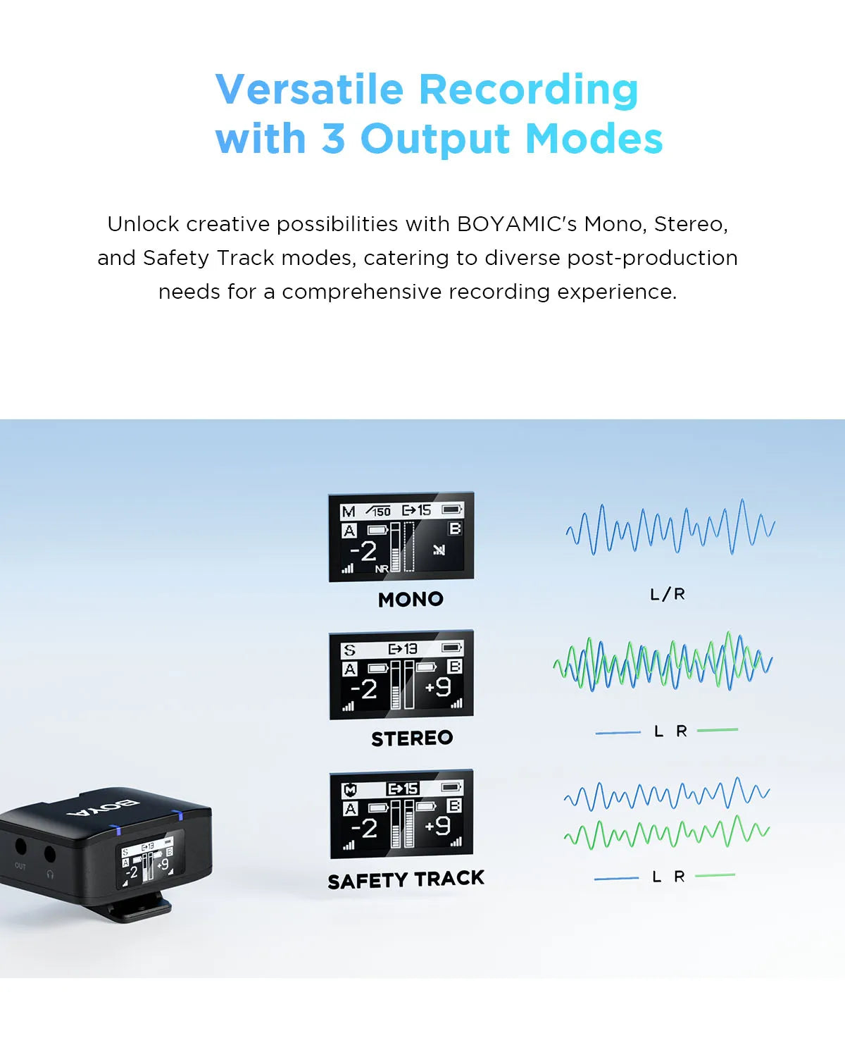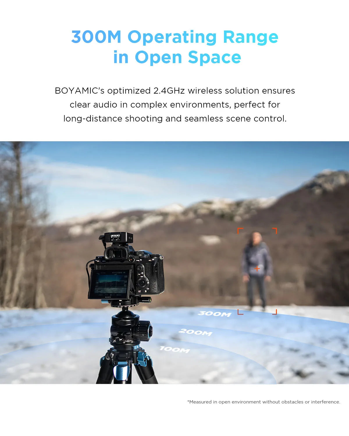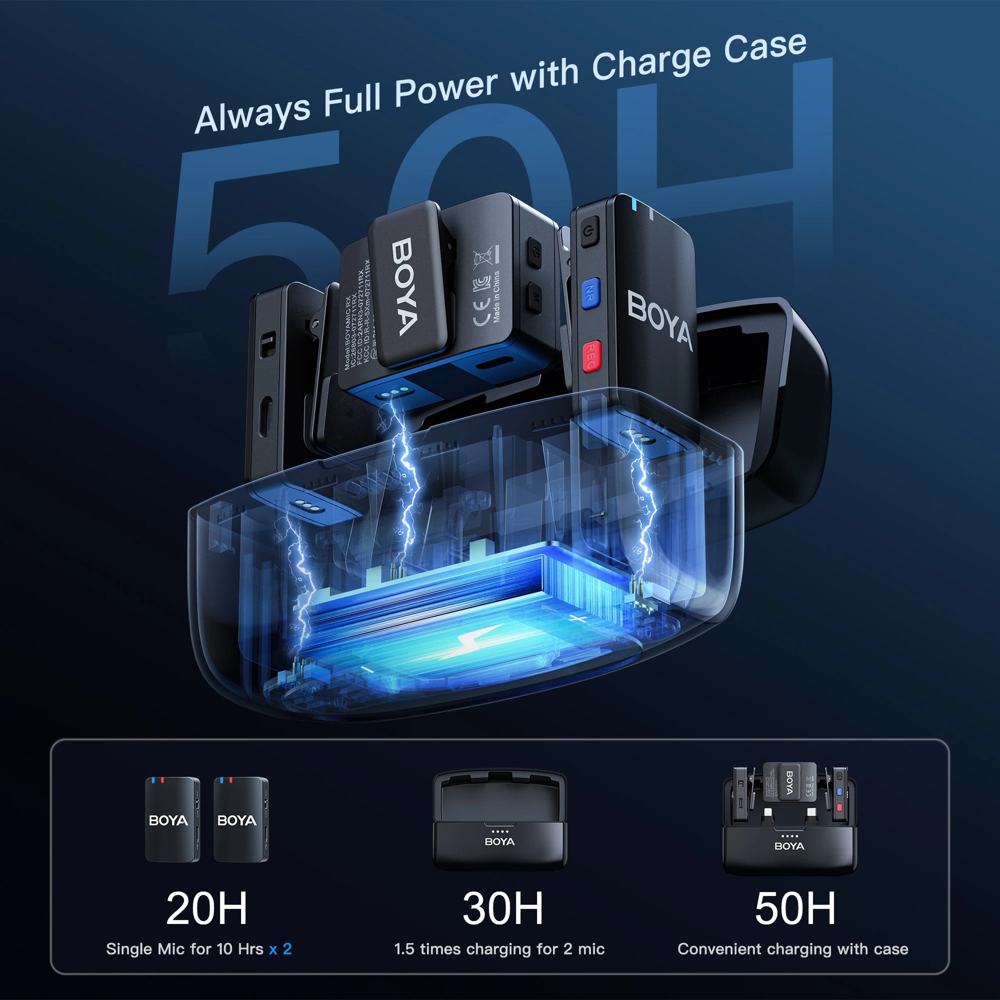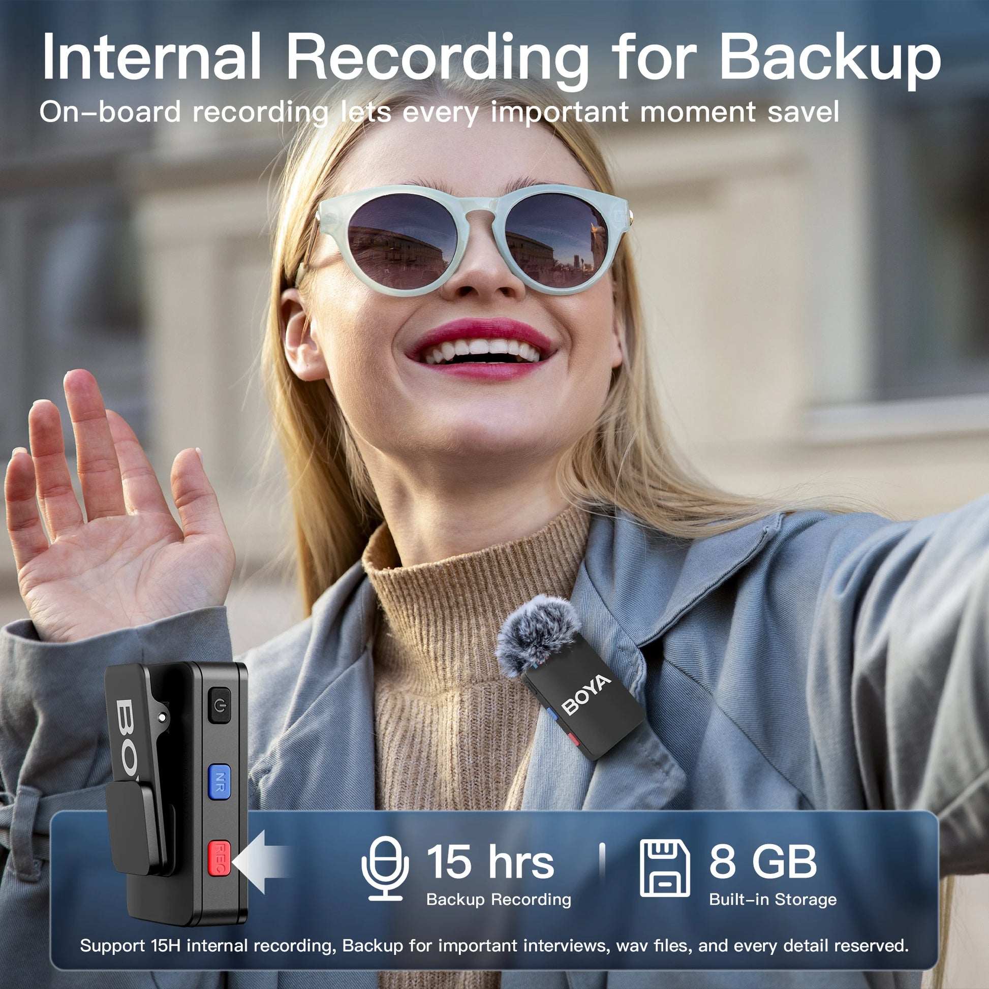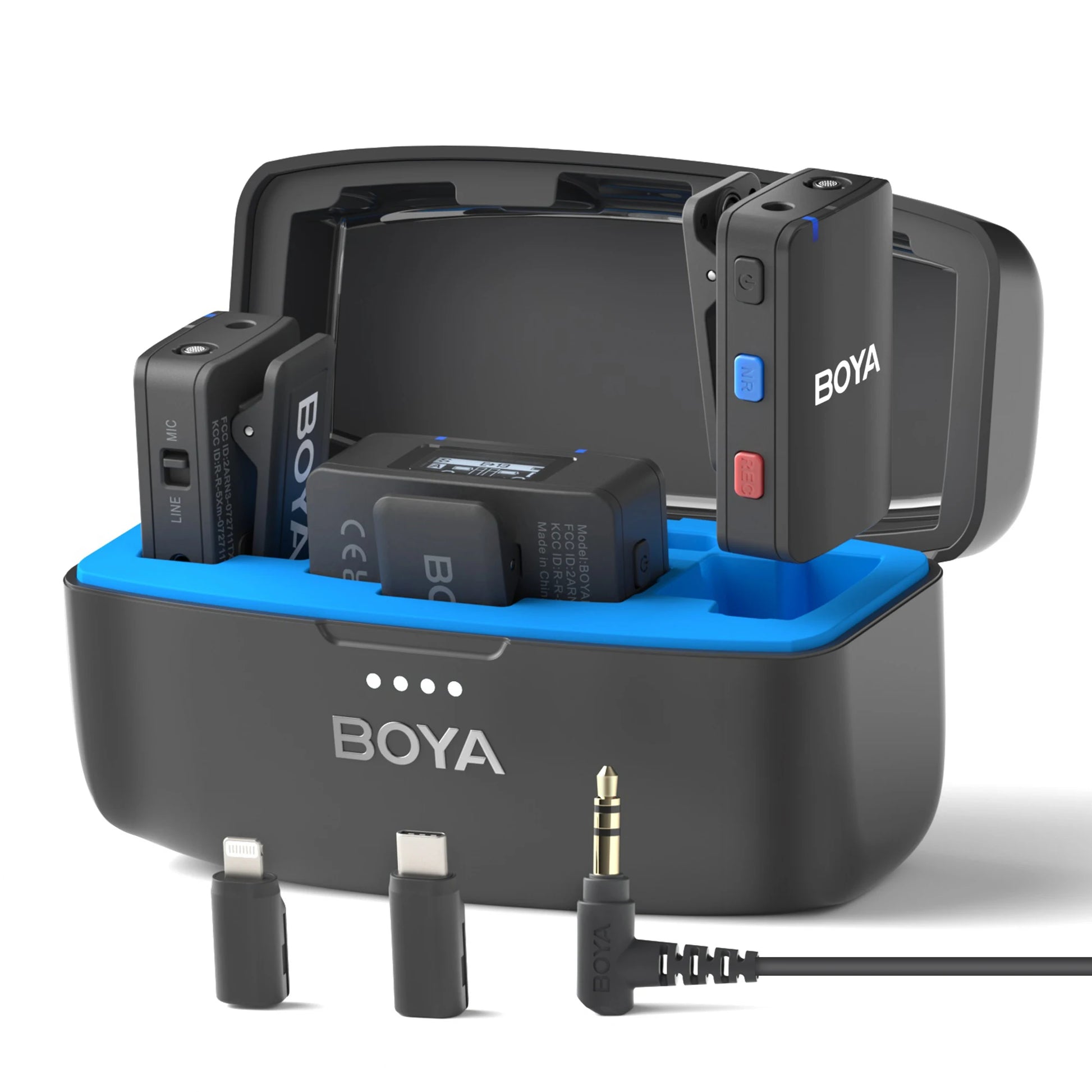 The BOYAMlC is a portable 2.4GHz wireless microphone system. ltfeatures high-performance noise cancellation, which is available forimproving the recording effect in a noisy environment. lt also boasts aremarkable onboard recording which is available for storing yourrecording files in real-time.