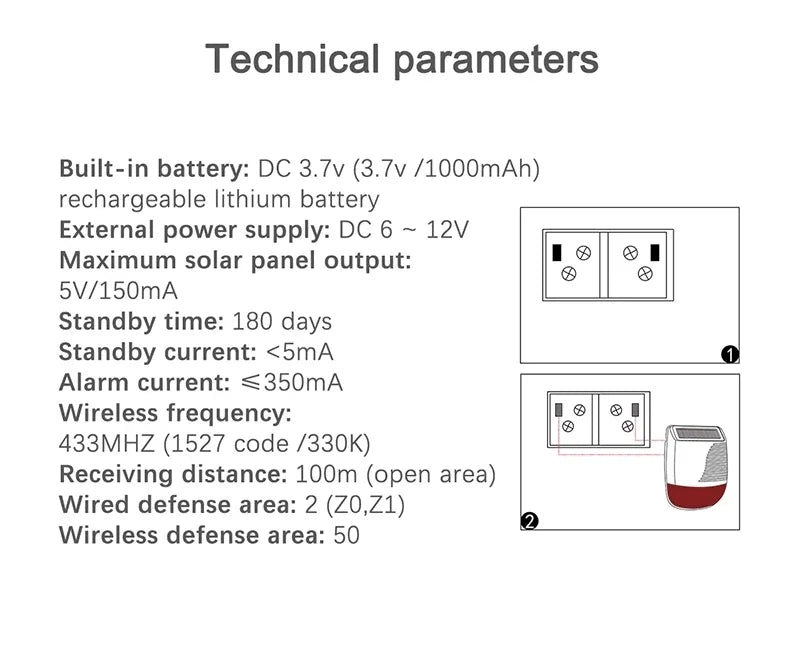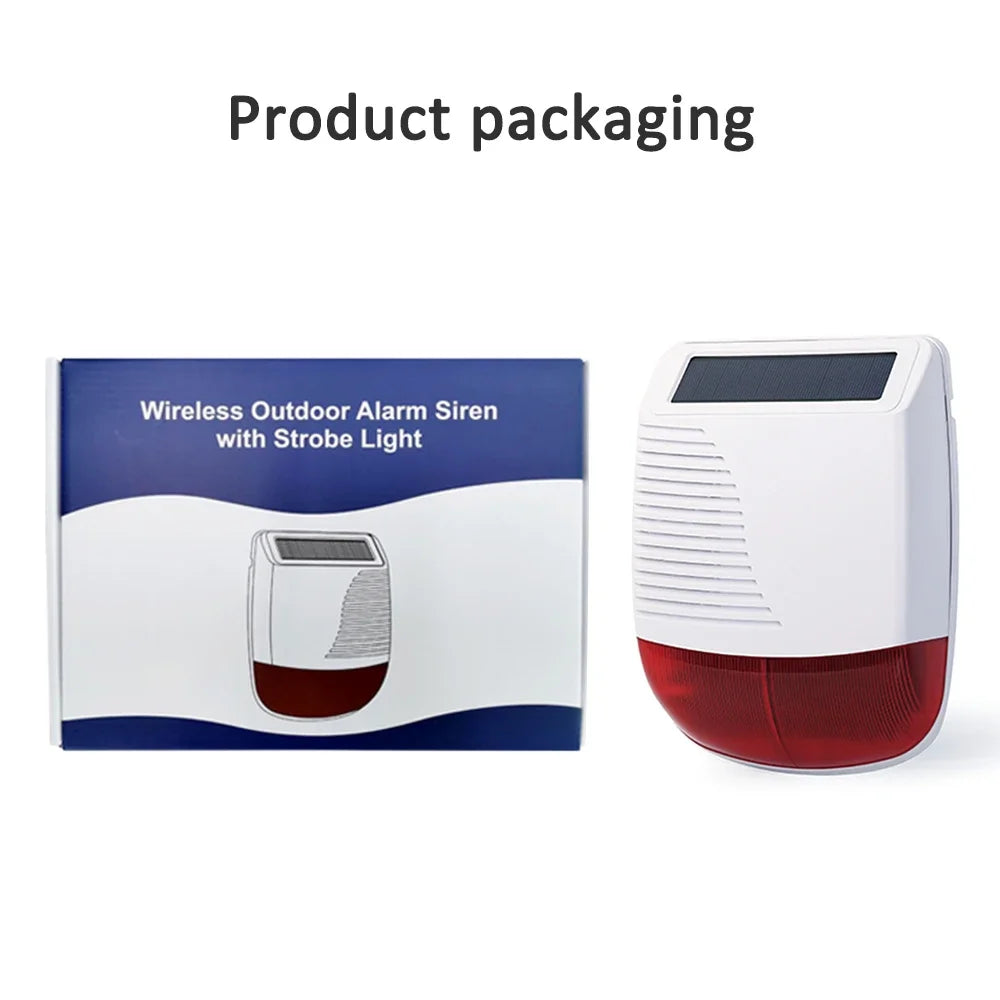 The outdoor solar siren is a detector that uses solar energy to power the system. Signal is transmitted by wireless or by wire. with wireless power and wireless signal, it improves the installation flexibility of the system. This detector can build multiple type of wireless alarms to scare illegal intruders off.