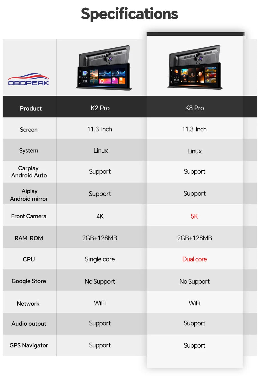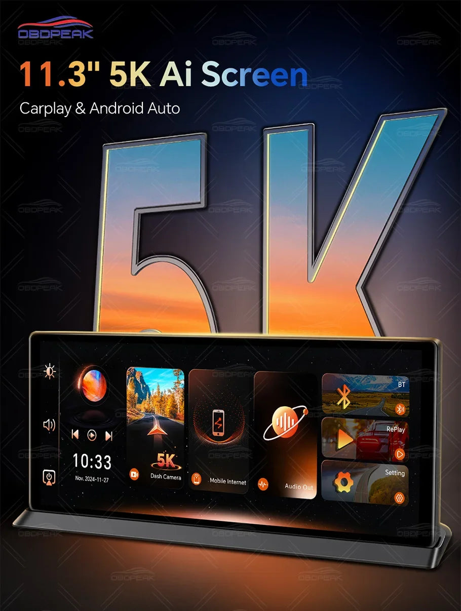 Dash Cam 5K Front Rear Car Camera Wireless CarPlay & Android Auto WiFi GPS 11.3" Touch Screen GPS Navigation Night Vision DVR