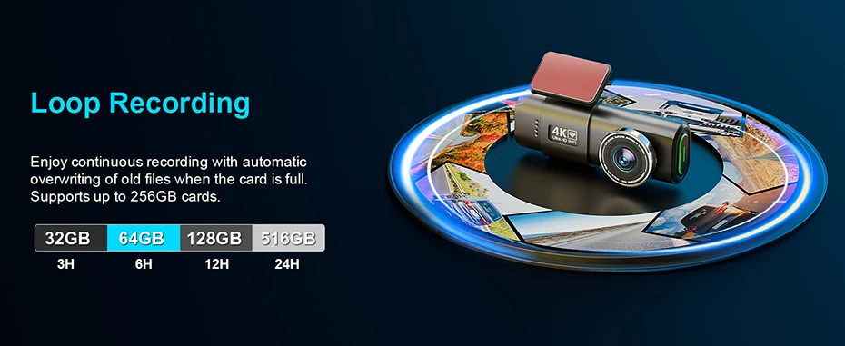 The dashcam accepts high-capacity micro SD memory cards up to 256GB (Not Included), providing additional video storage. It captures everything of the wonderful trip or scenery at any time and from any location.