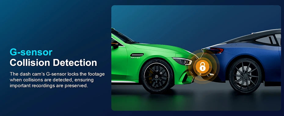 The Car DVR will automatically save and lock the video when the G-sensor receives the signal of sudden impact or collision, Loop Recording will also skip the emergency locked video.