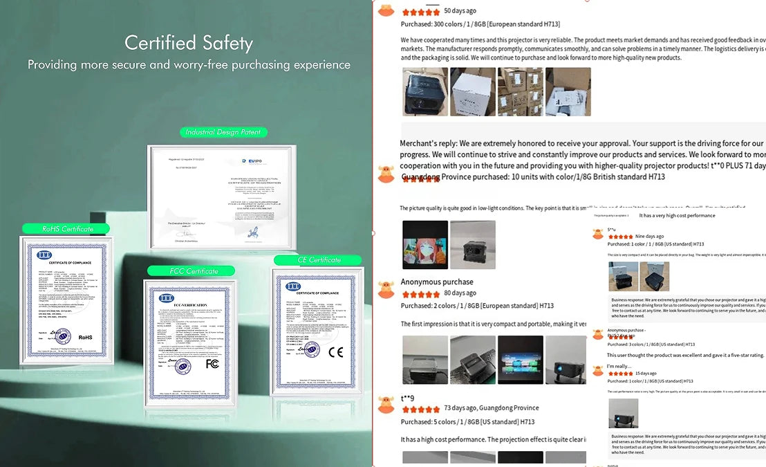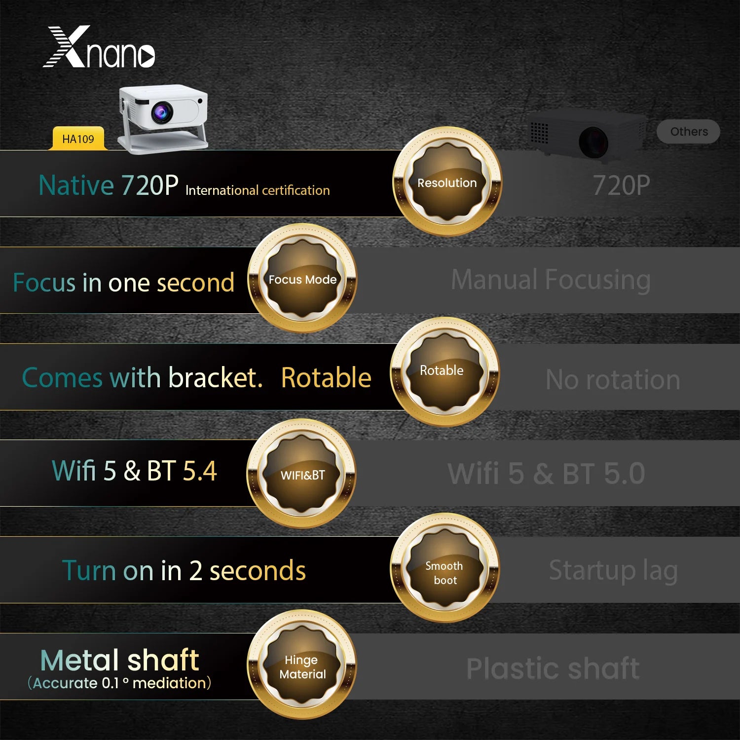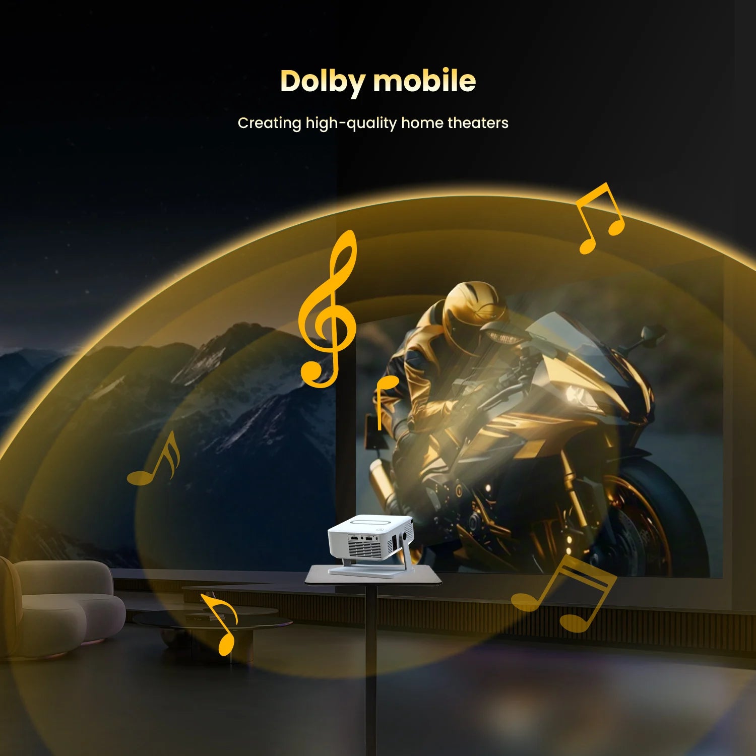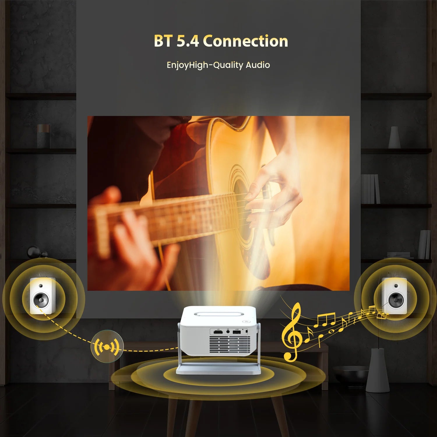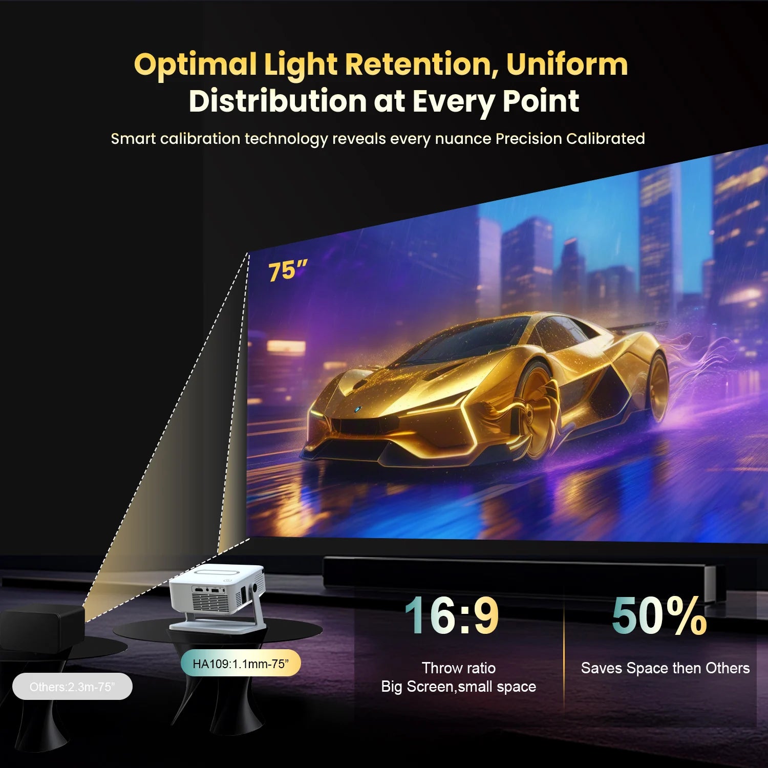 The HA109 projector supports Android 11.0 and Bluetooth 5.0, boasting native 720p HD. Portable and compact, with a recommended screen size of 40-120 inches, it's ideal for dormitories, outdoor settings, family gatherings, parties, and small meetings. It supports wireless projection with DLNA, AirScreen, and GoogleCast, making it incredibly easy to use.
