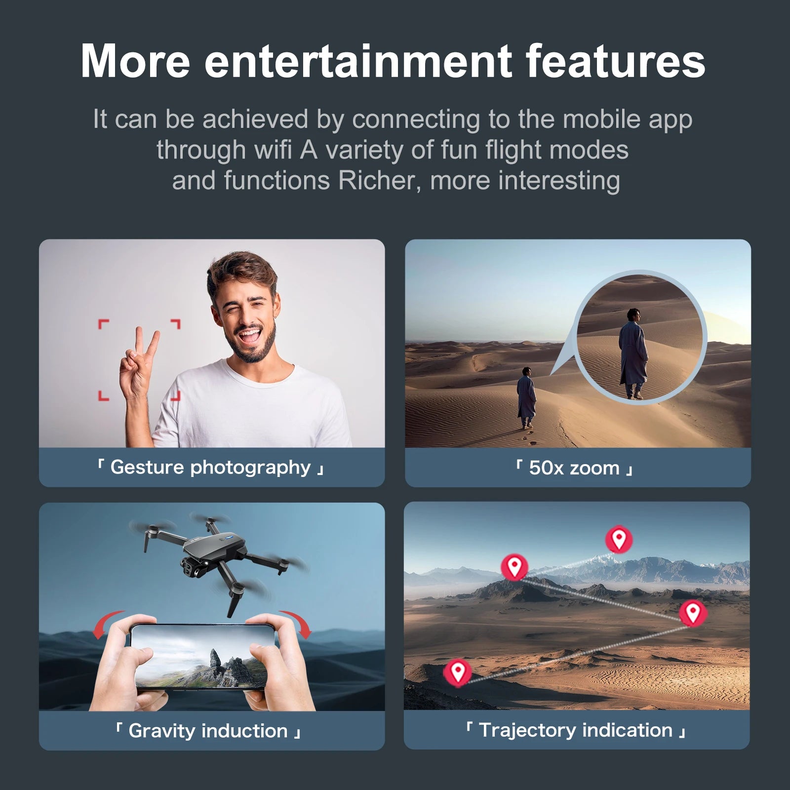 Remote control with screen, brushless powerful motor, optical flow positioning, six way gyroscope; One click takeoff, one click landing, ascent and descent, forward and backward, left and right side flight, steering, headless mode, body lights, gesture photography and video recording, headless mode, emergency stop, trajectory flight, gravity sensing, music, 50x zoom, automatic photography