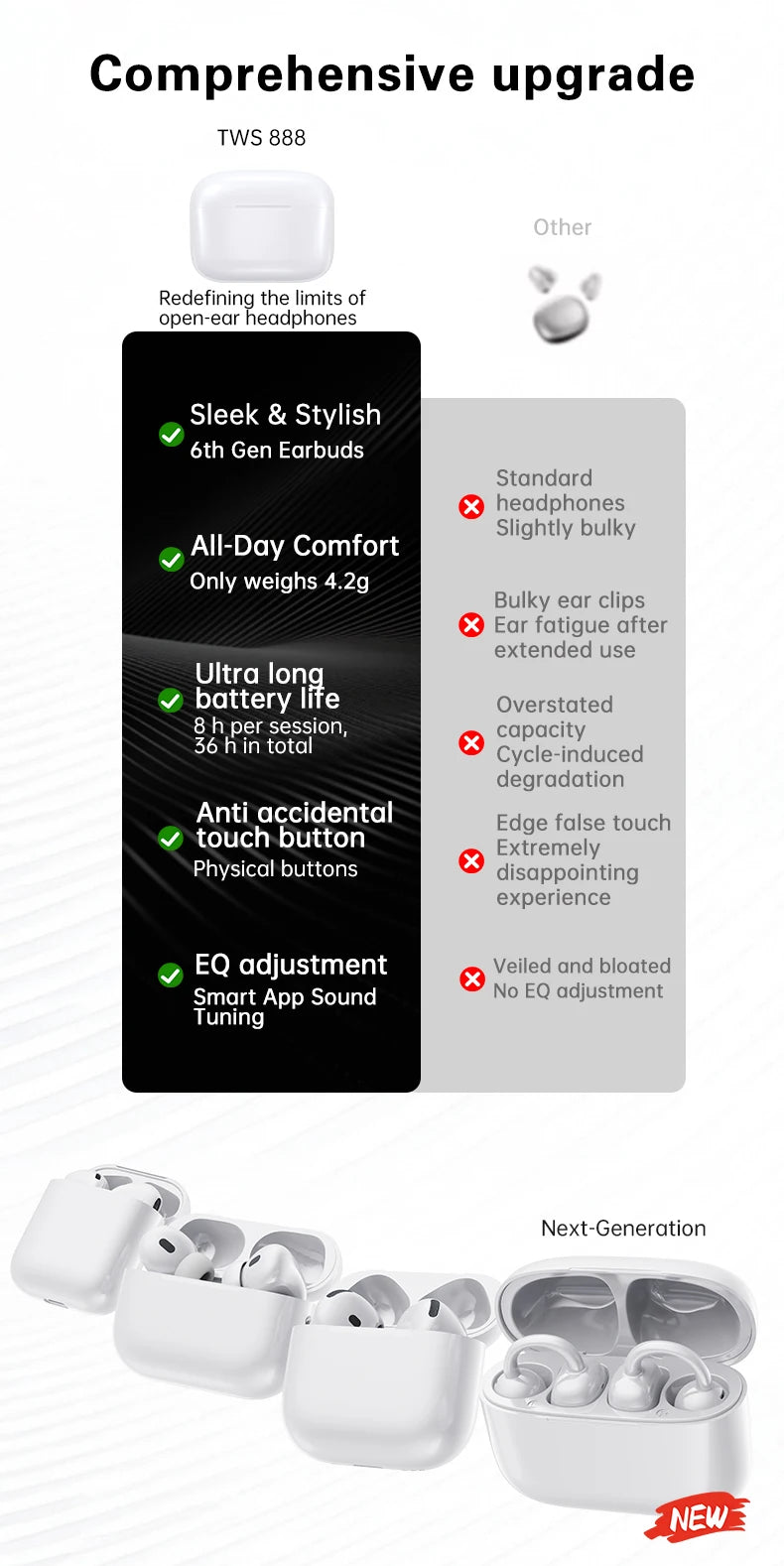 Ear Clip Earbuds 6th Gen Bluetooth 6.0 Headphones Surround Sound Earphone Touch Control Wireless Headset Noise Reduction HD Call