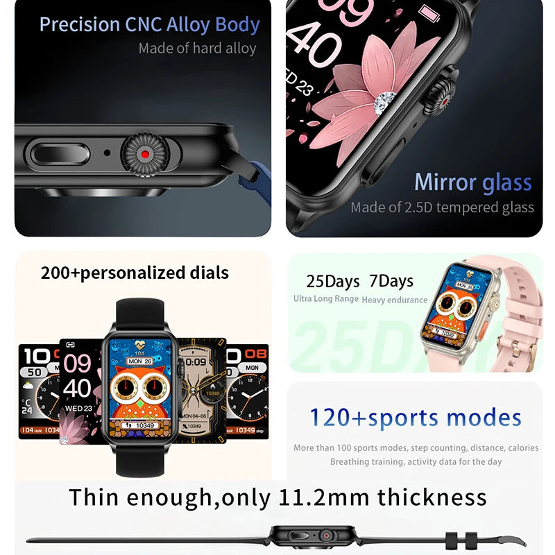Answer, make calls, switch between multiple dials, self-editing dial, call log, dial pad, contacts, call alert, time display, timer (stopwatch,countdown), find bracelet, alarm, weather, photo control, music control, flip wrist light up, time format switch, stress relief sleep aid, torch, drain function, brightness adjustment, do not disturb mode, theatre mode, vibrate switch, Bluetooth switch for calls, voice assistant, OTA, blood oxygen detection, blood pressure detection, heart rate detection, sleep detection, sedentary reminder, cycle reminder, water reminder, dial selection, all-day heart rate, QR code download, restore factory settings, pedometer, calorie display, distance