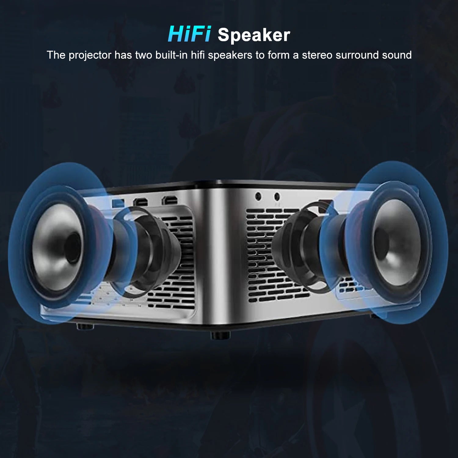 The projector has two built- in hifi speakers to form a stereo surround sound