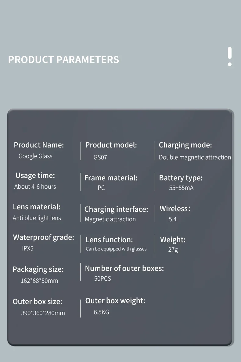 Packing:Smart Glasses charging cable, storage pouch, cleaning cloth, user manual, packaging box