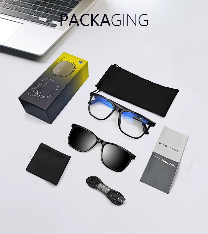 Packing:Smart Glasses charging cable, storage pouch, cleaning cloth, user manual, packaging box