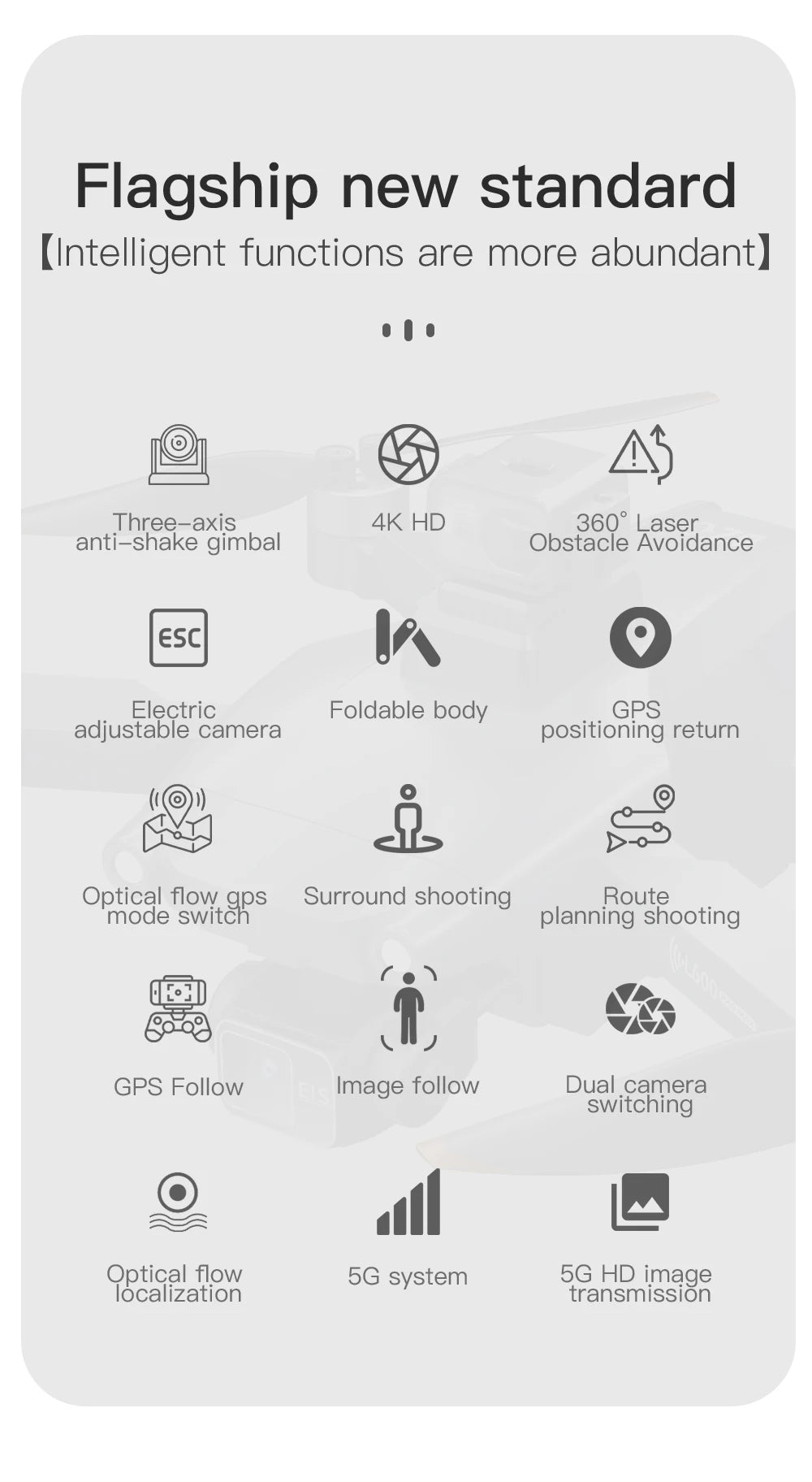 1. 360° laser obstacle avoidance, 3-Axis gimbal, automatically detect obstacles within 20 meters, making flight safer. (obstacle avoidance device optional).