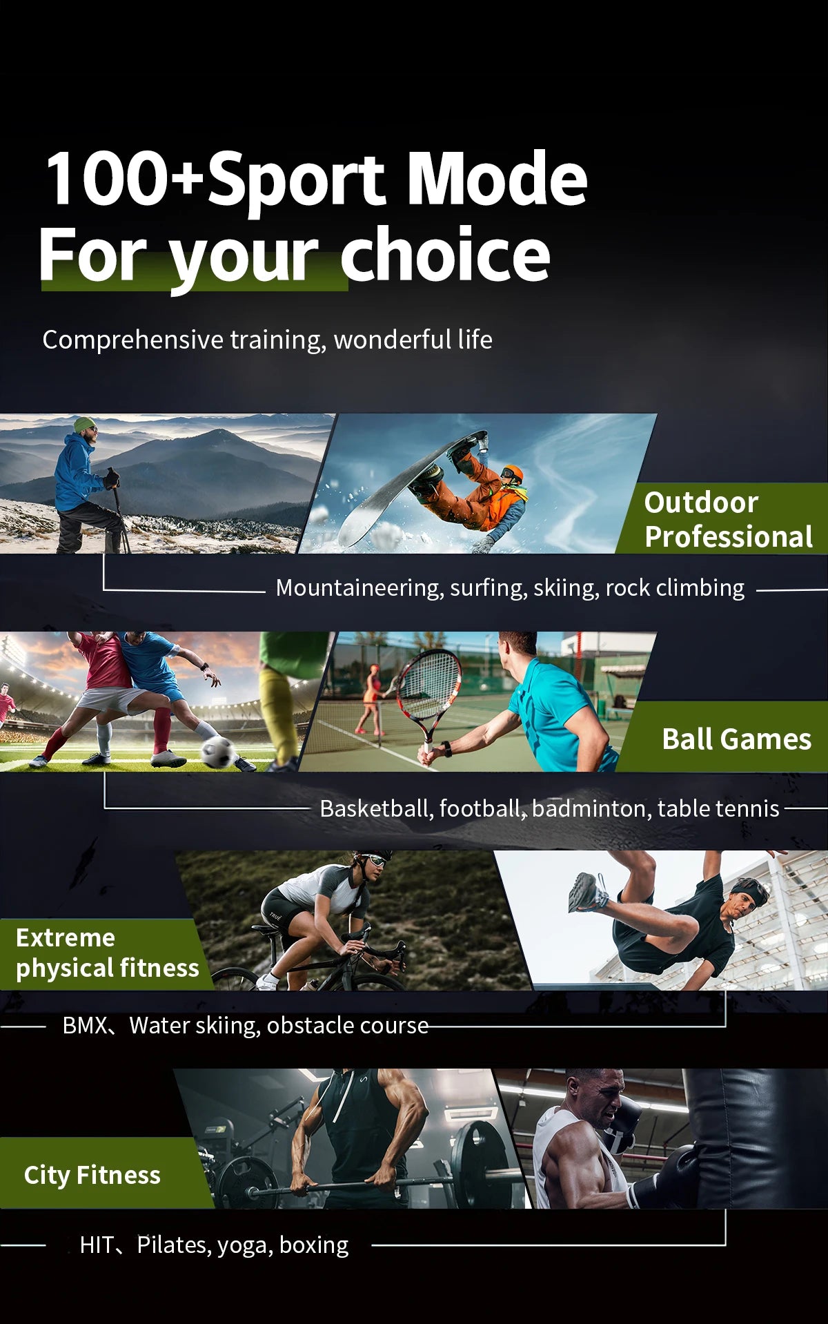 ▶Sports/100+ modes: 100+ modes of exercise (walking, outdoor running, cycling, fitness bike, swimming, yoga, elliptical machine, basketball, football, badminton, table tennis, rugby, tennis, baseball, jump rope, mountaineering, long jump, hula hoop, volleyball, golf, sit-up