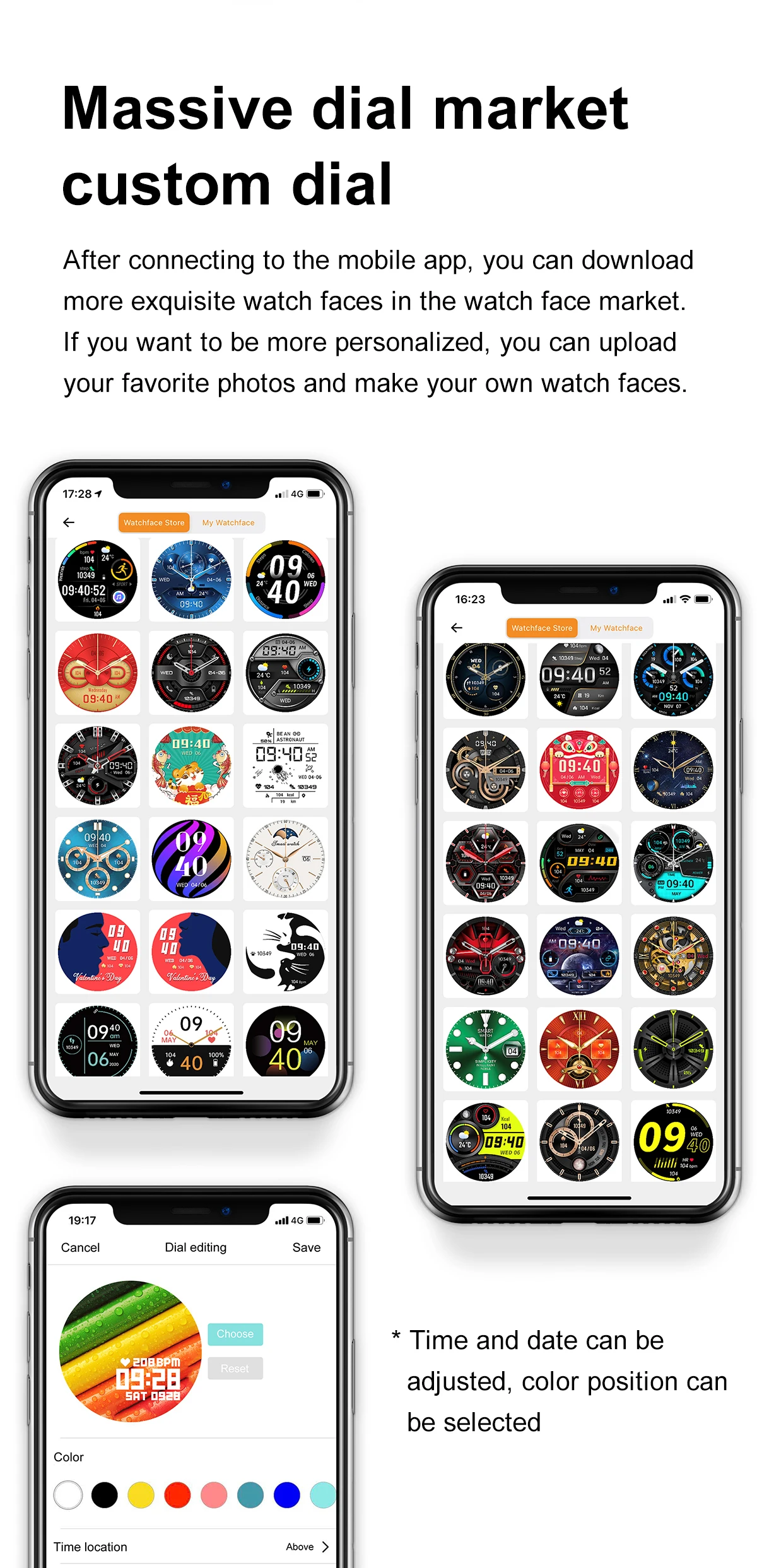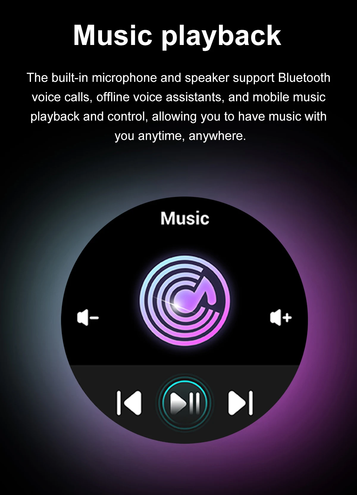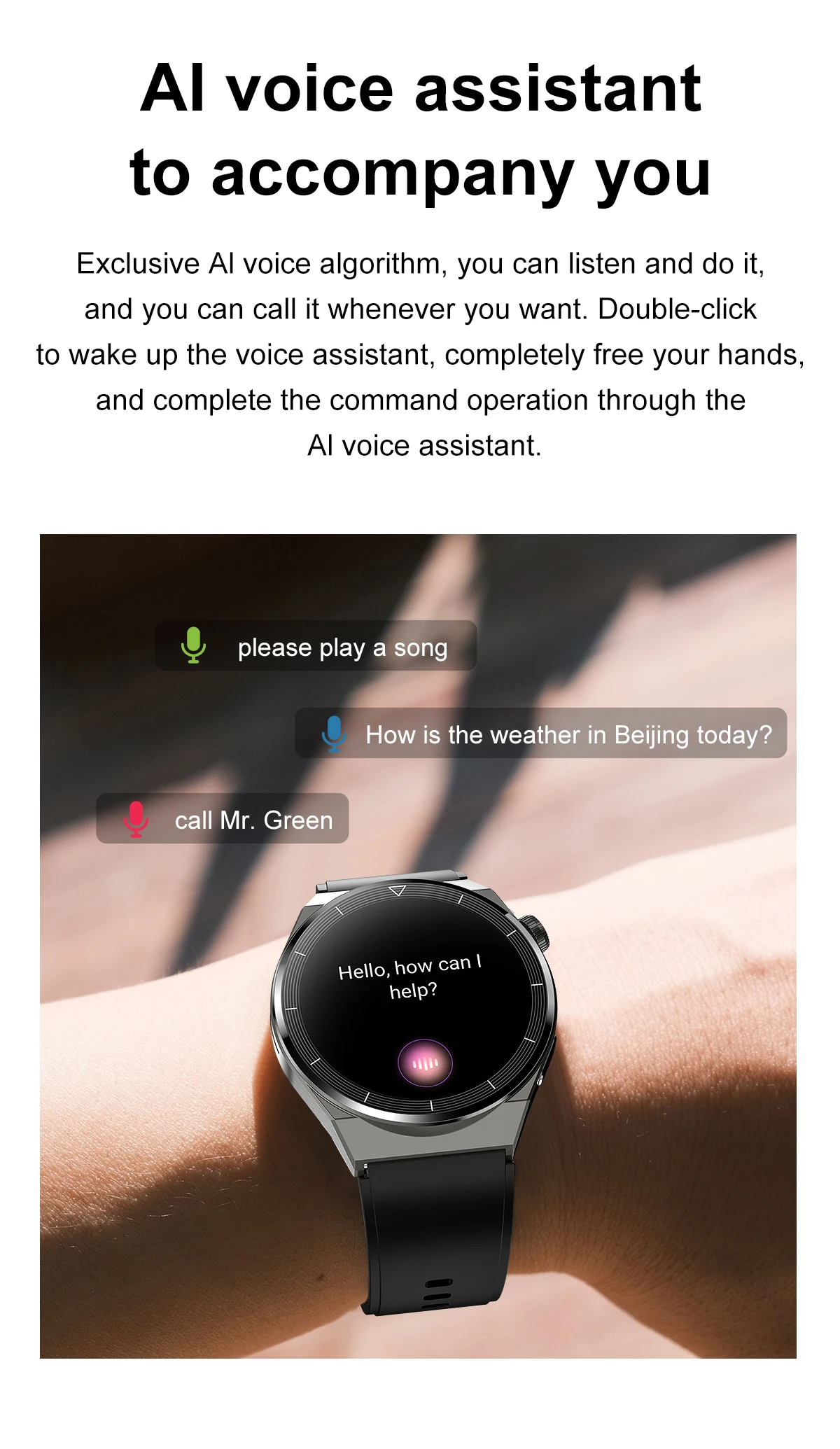 Life: AI Voice assistant,NFC unlock function,Password unlock,Bluetooth Answer Call, Bluetooth Dial Call, Messages Reminder, Alarm clock, Weather, Music remote, Camera remote, Flashlight, Find phone, Dynamic watch face, watch face market (100+ watch faces), custom watch faces(you can set the picture you like as the watch face), Set the screen off time, Do not disturb mode.