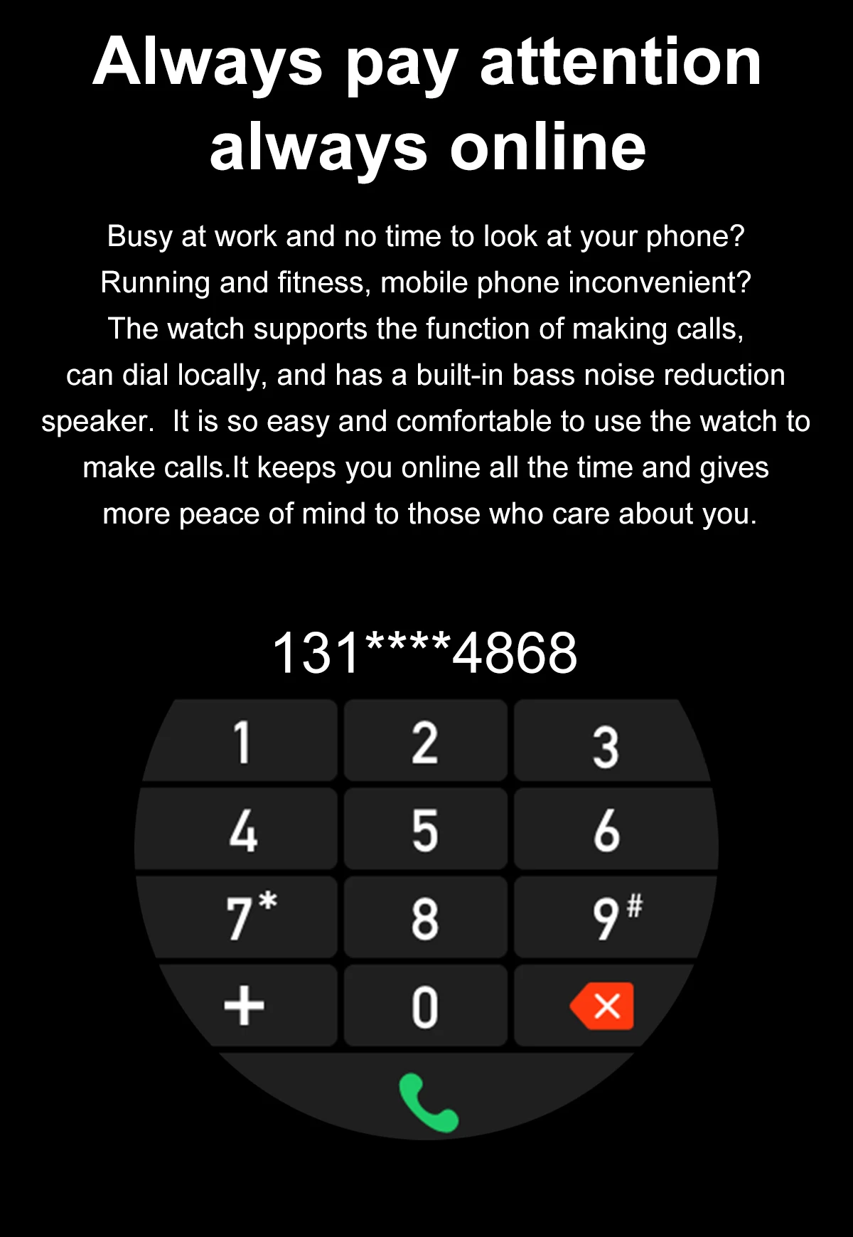 the watch supports the function of making calls,can dial locally,and has a built-in bass noise reduction speaker.it is so easy and comfortable to use the watch to make calls.It keeps you online all the time and gives more peace of mind to those who care about you.