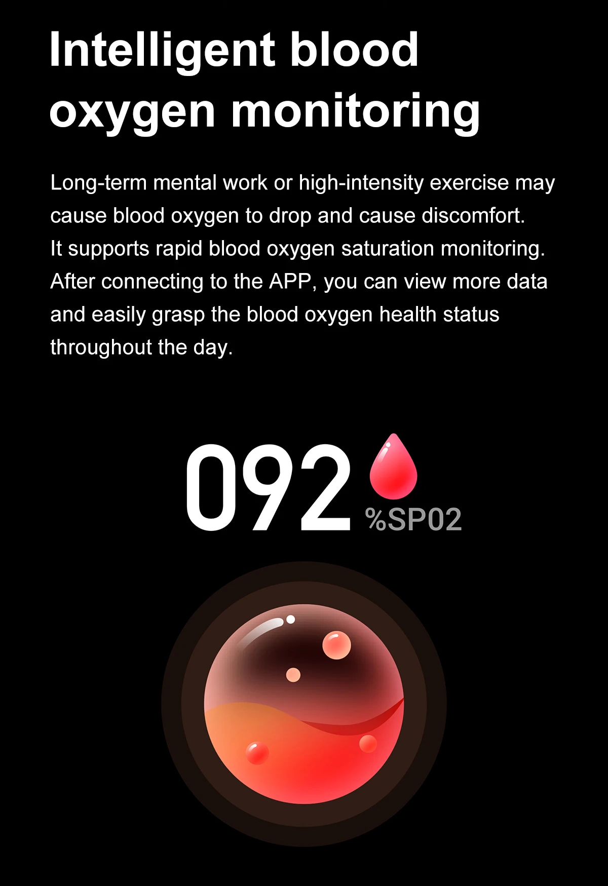 Health: 24/7 Heart Rate monitor, Blood Pressure, Blood Oxygen, Sleep tracker, Breathe, Drink water reminder, Reminder to move, Women's menstrual period reminder, Support health APP.