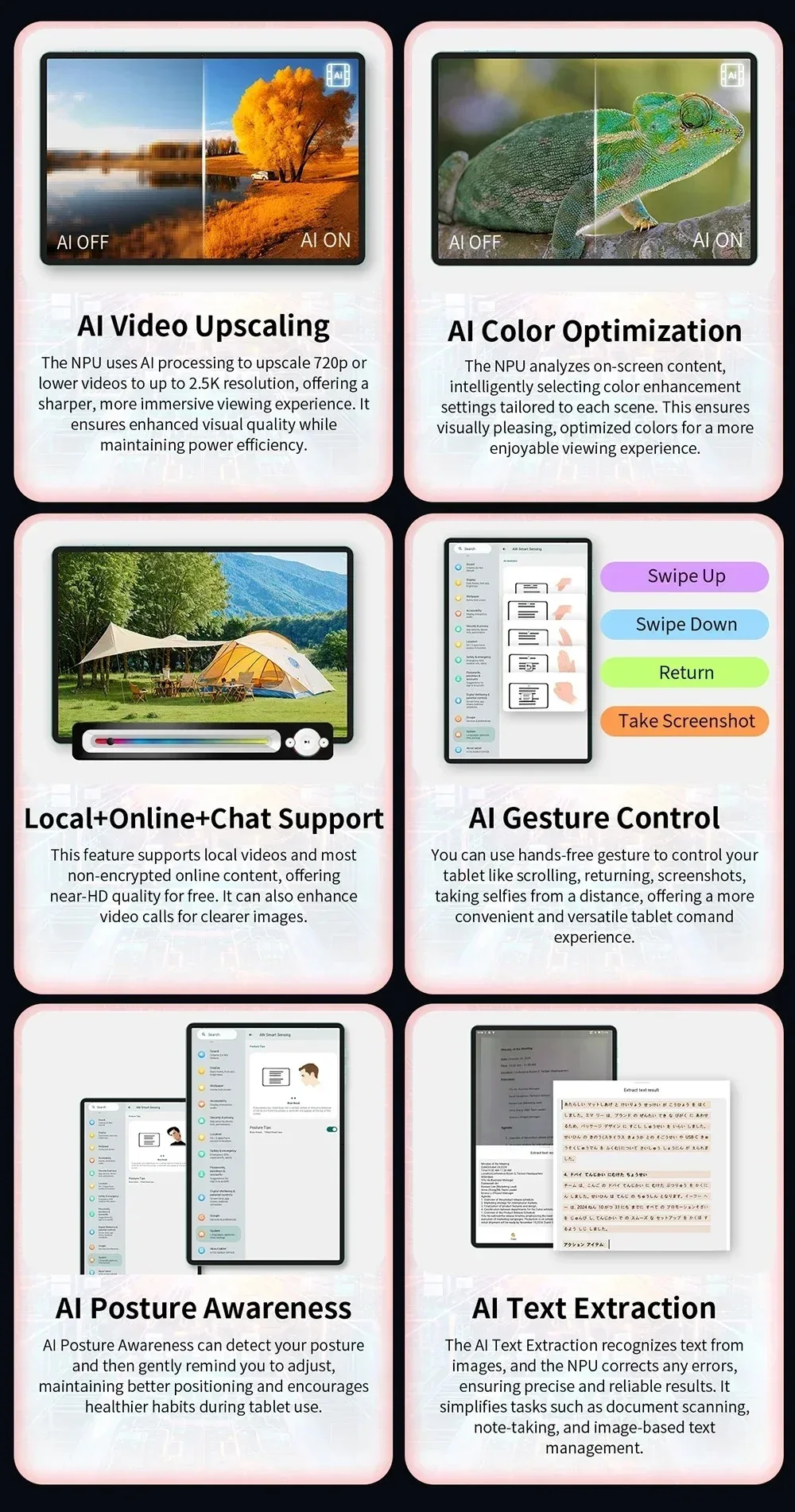 [AI in Action] Unlock a smarter tablet experience with AI-driven functionalities: Video Upscaling for enhanced visuals, Gesture Control for touchless interaction, Text Extraction for efficient text recognition, and Posture Awareness to promote healthier usage.