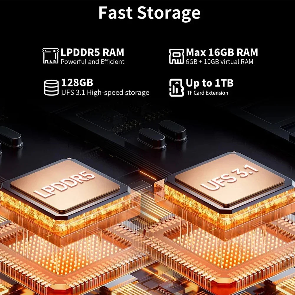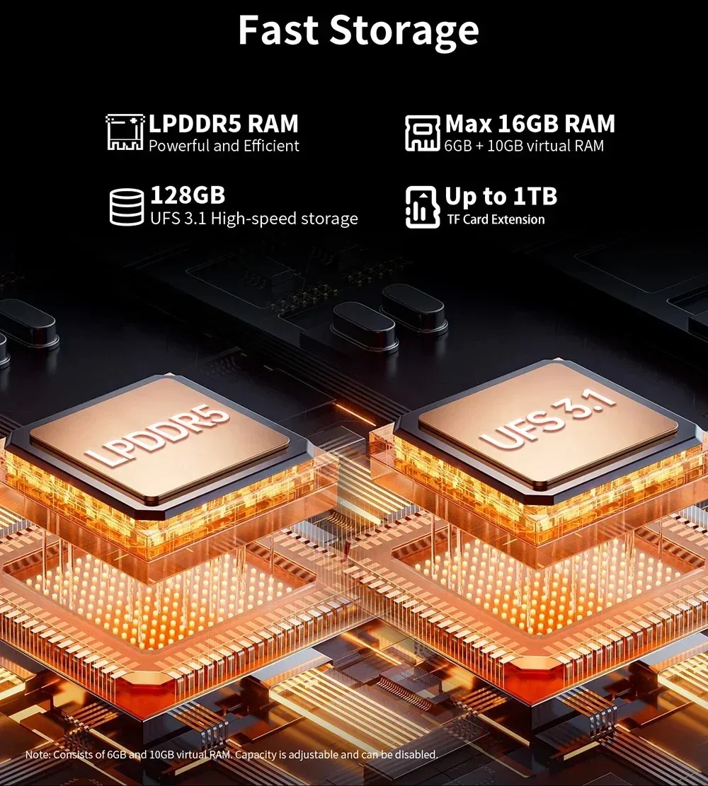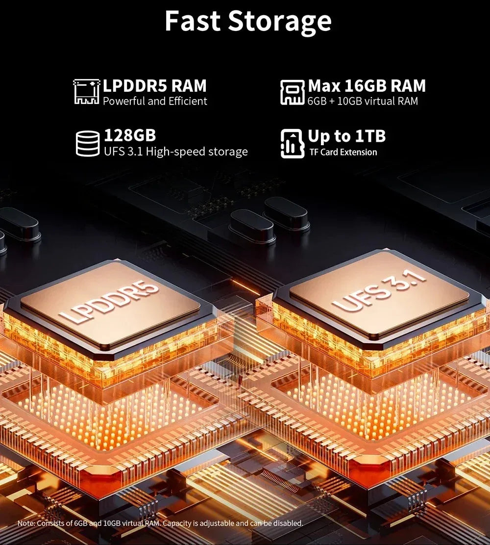 [Memory and Storage] With up to 16GB RAM (6GB LPDDR5 + 10GB virtual) and 128GB UFS 3.1 storage, the T60AI ensures fast access to data and ample space for apps and media, supporting efficient multitasking.