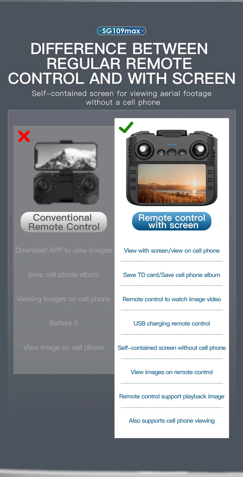 SG109 MAX GPS Drone features: Upgrade large screen remote control, intelligent obstacle avoidance, EIS dual camera, brushless motor, GPS+ optical flow positioning