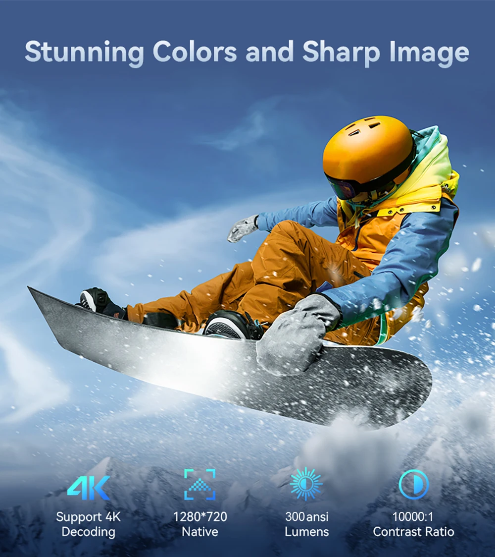 Native 720P resolution with 4K decoding, 300 ANSI and 10000:1 contrast ratio, this projector provides sufficient brightness for casual movie watching or kids' shows. It's easy to use, affordable, and good for daily family entertainment or short trips!