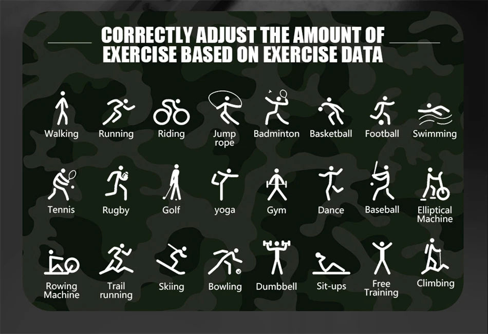 2. Exercise/24 sports: walking, running, cycling, rope skipping, badminton, basketball, football, swimming, tennis, rugby, golf, yoga, gym, dancing, baseball, Elliptical trainer, rowing machine, Cross country running, skiing, bowling, dumbbells, Sit-up, free training, mountaineering