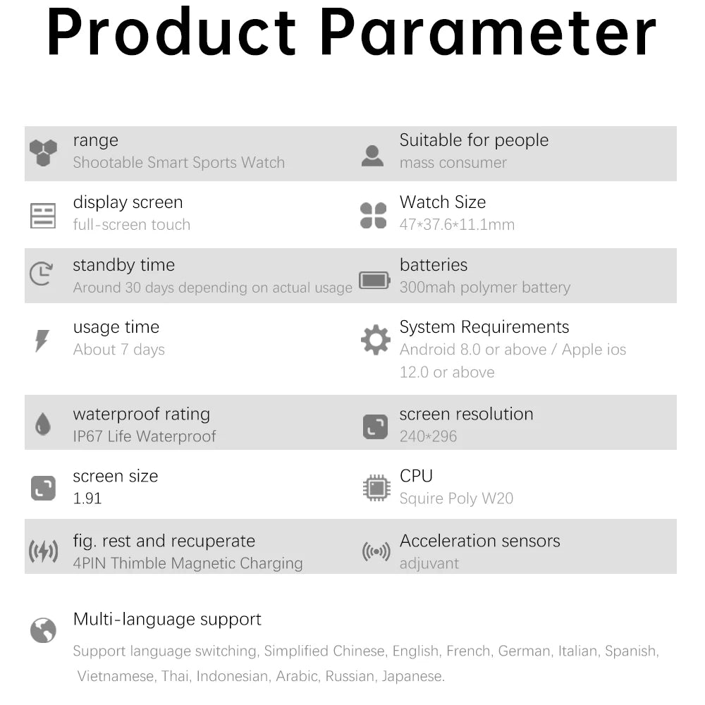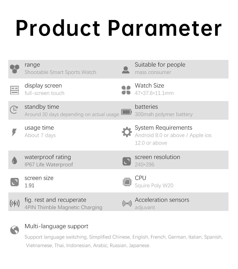 Watch side support language: English, French, Spanish, Arabic, Russian, Portuguese, Simplified Chinese