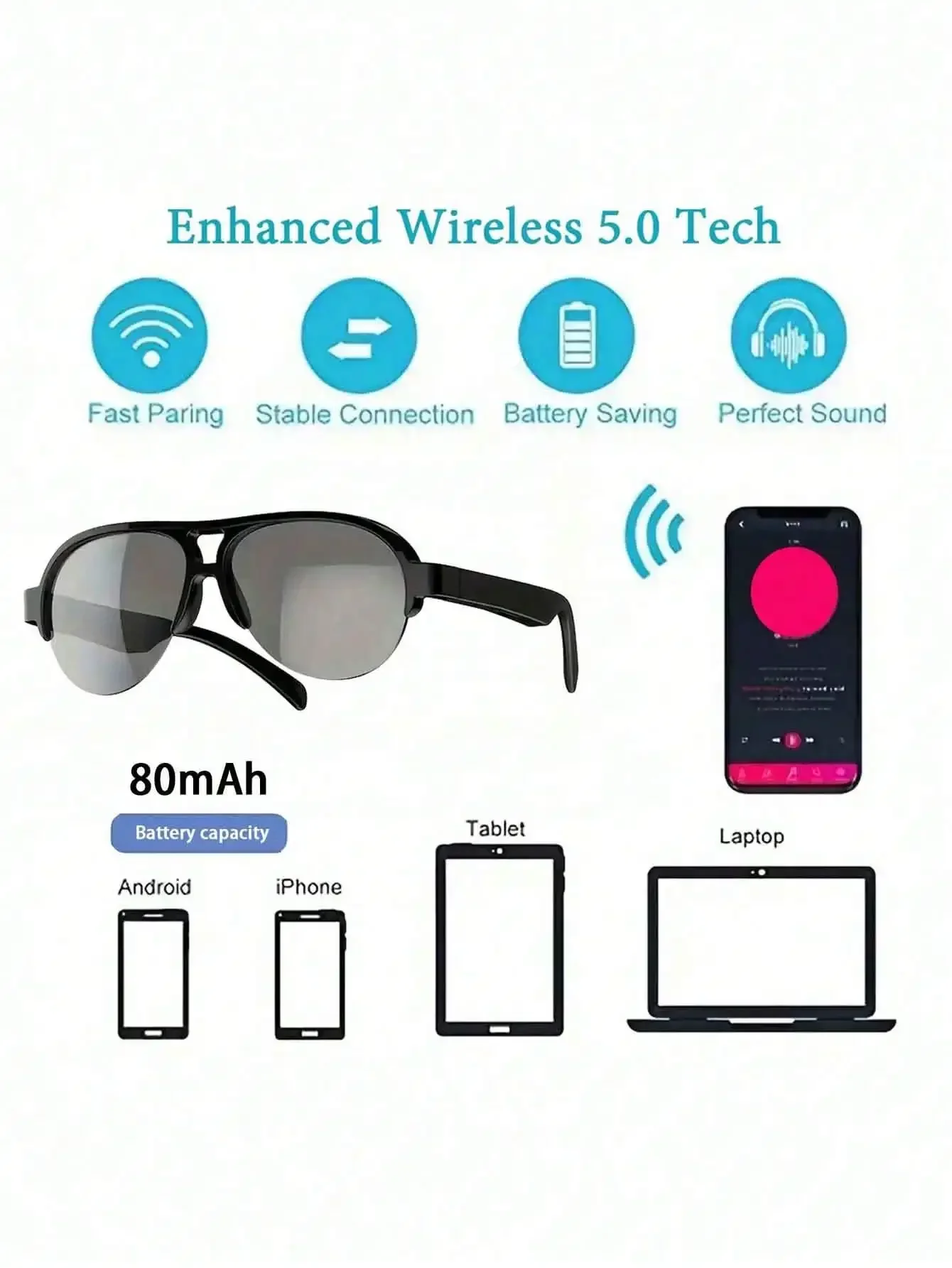 V5.3 Smart Wireless Glasses - Touch HD Lens, High Fidelity Audio, Wireless Call and Music, Rechargeable Battery, Outdoor Sports