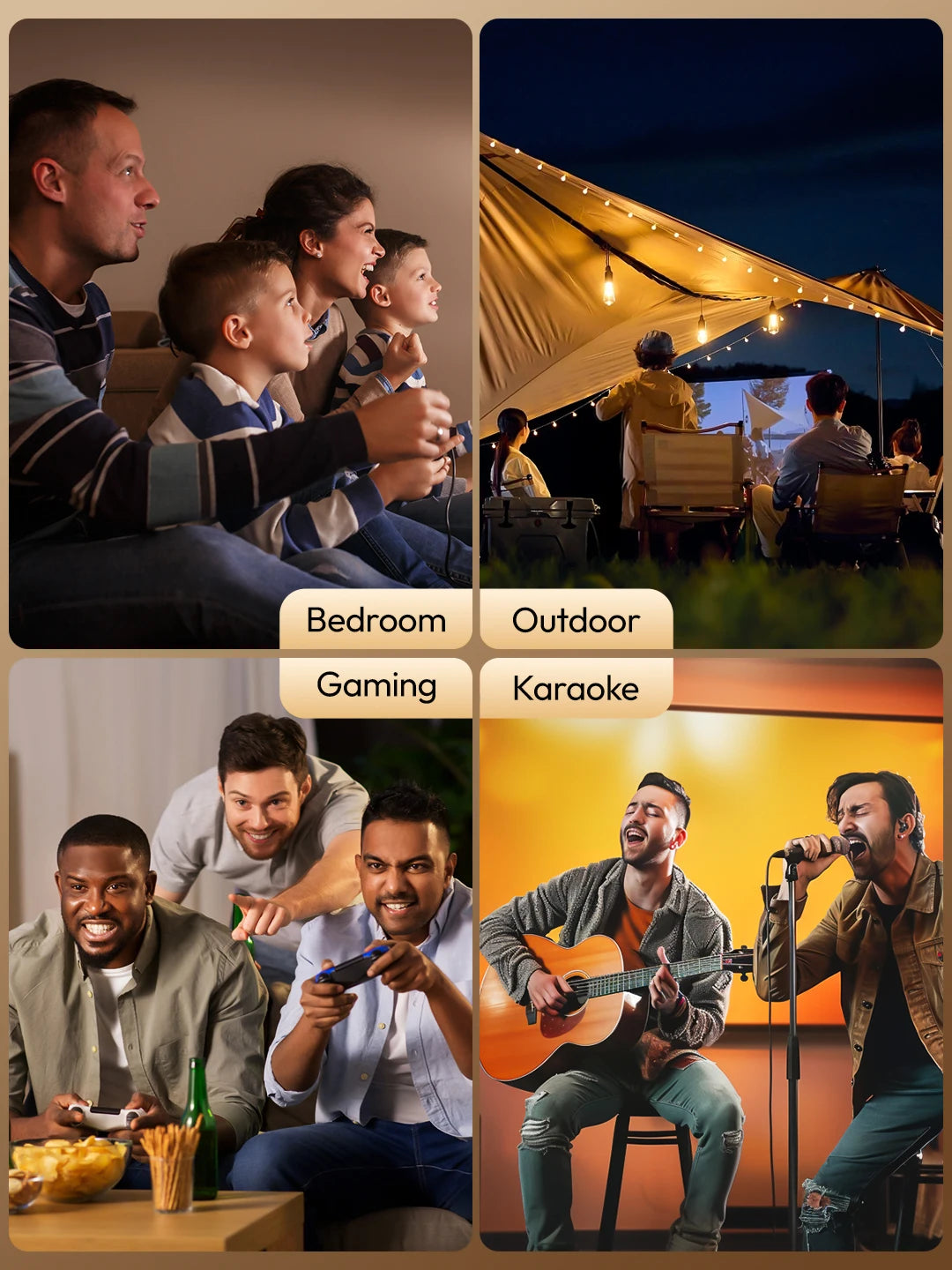 360° adjustable projection offers ultimate flexibility. Easily project onto ceilings, walls, or floors for the perfect viewing angle in any space. Automatic keystone correction ensures a sharp, squared image from every position - ideal for bedrooms, classrooms, or impromptu outdoor movie nights.