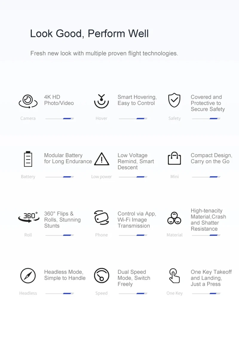 Headless Mode :Orients the quadcopter's flight on the controller. No more worries about the drone getting out of control.